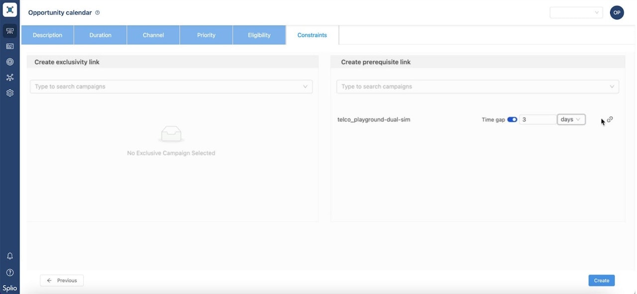 👉 From the Constraints tab, on the right-hand side of the screen, you define the opportunity you want to link with a prerequisite.